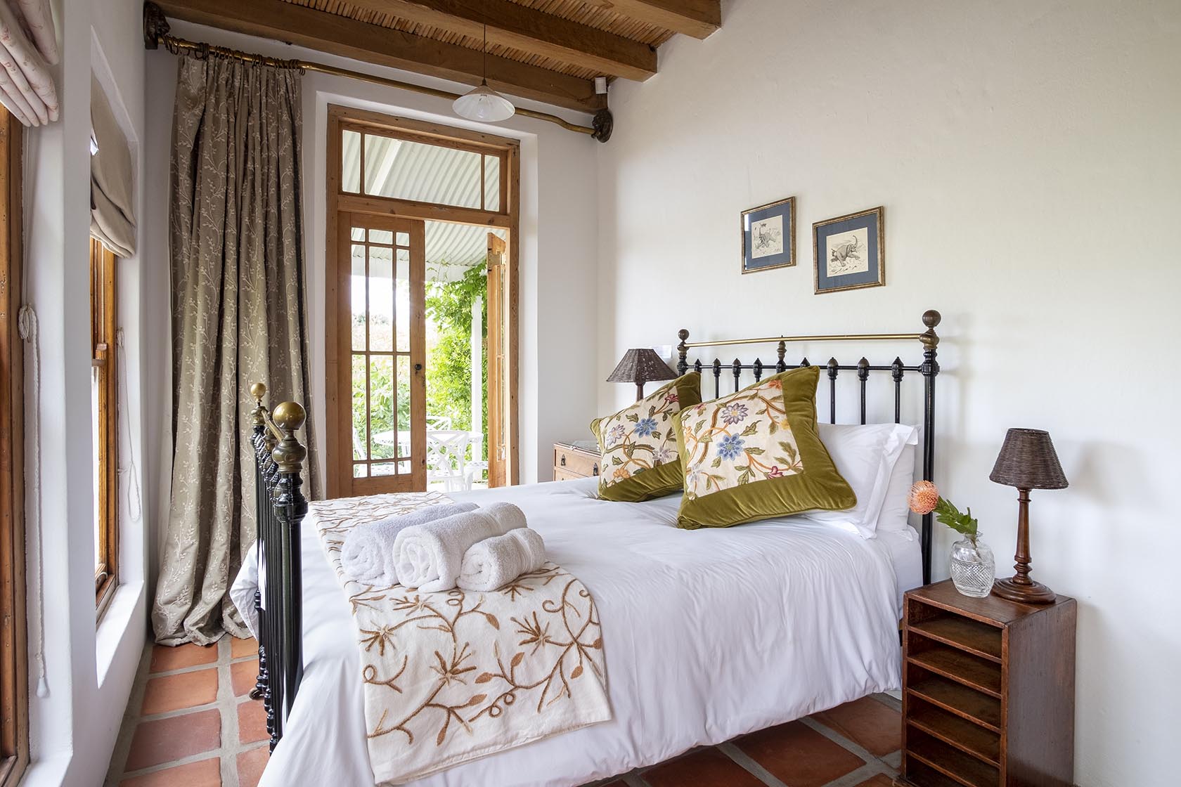 A laidback, open-plan living, dining and cooking space flows out onto the stoeps and into the garden, with the three bedrooms flanking the entertaining areas. Family heirloom furnishings, luxury linens and sentimental collectables add to the cosy country charm of the hideaway. Beautiful French doors lead out from the main ensuite, onto the verandah where an outdoor shower awaits your morning wake-up with the cackles of the resident guinea fowl. A hot brew escorts you to the front stoep where you’ll witness the surrounding mountains come to colour, as the residents ride their horses or walk their dogs down the lanes; their friendly smiles reaffirming an ardent affection that comes with the community.