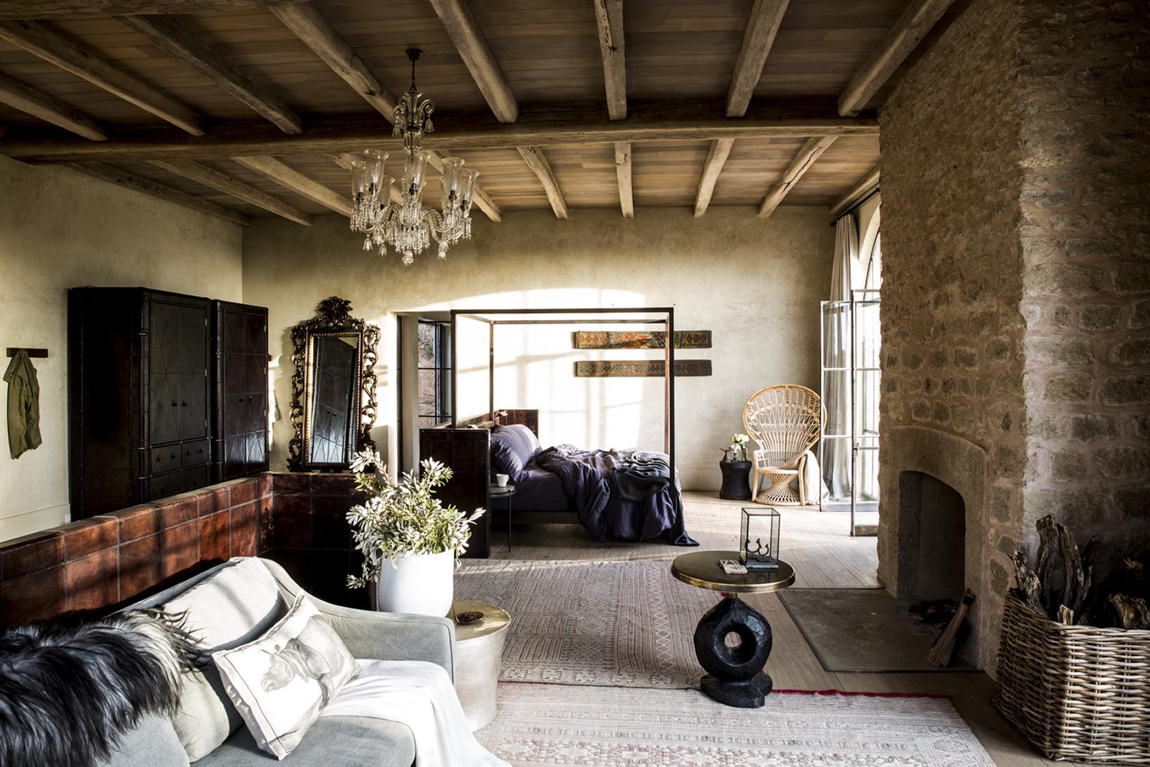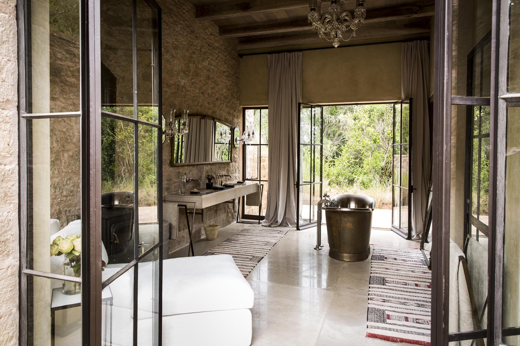 Floor to ceiling windows and glass doors bathe rooms in light, which showcases the varied textures within: soft throws on king-sized beds, leather desks, copper baths, crystal wall lights and roaring log fires create a deeply romantic and welcoming suite.