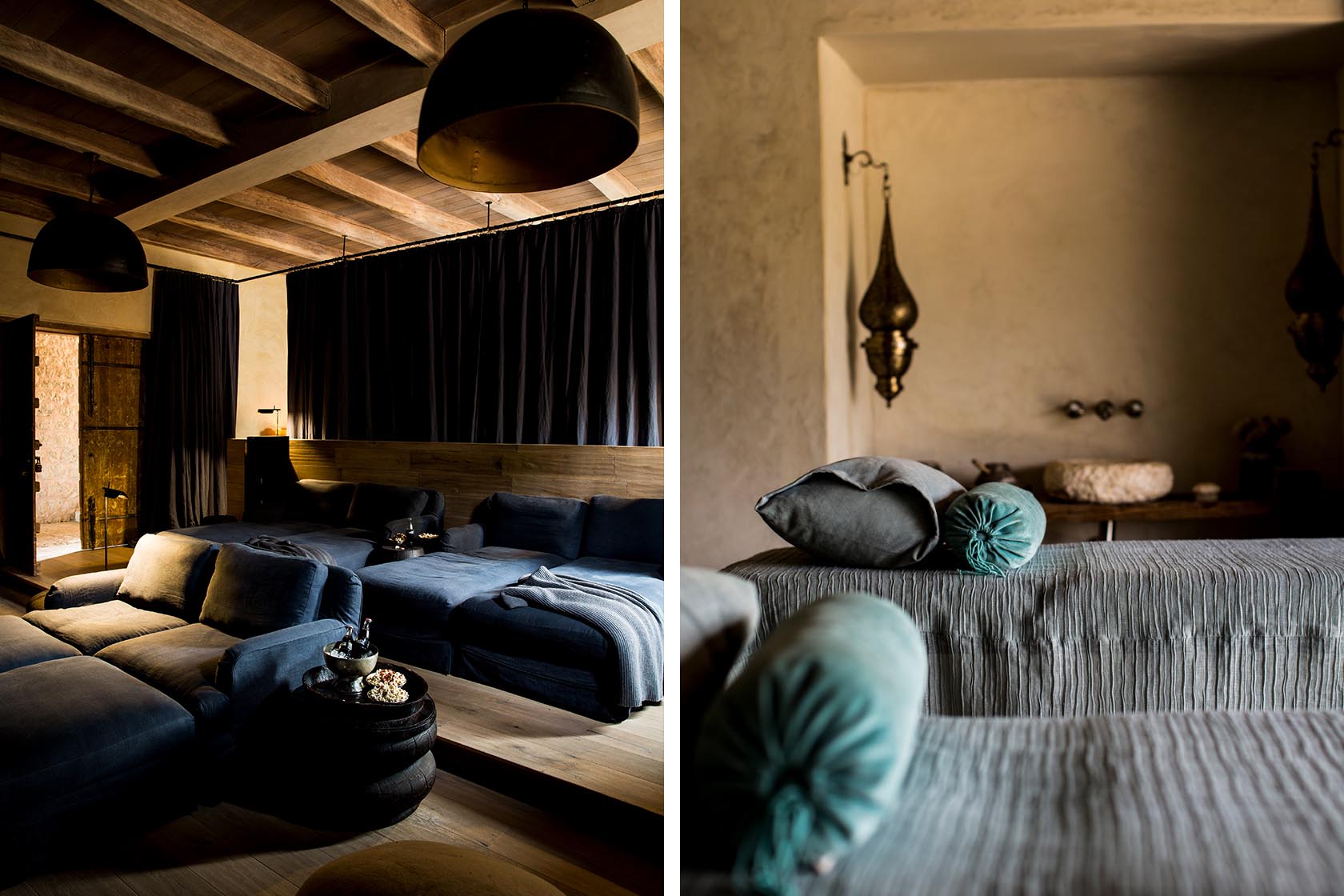 Walls of hand-cut Meru stone and rustic materials epitomise the family’s love of conservation and sustainability. The African safari lodge, built from rock and grass, blends into the hillside completely and is solar powered. Inside, colours are also natural with raw stone walls and décor sans colour.