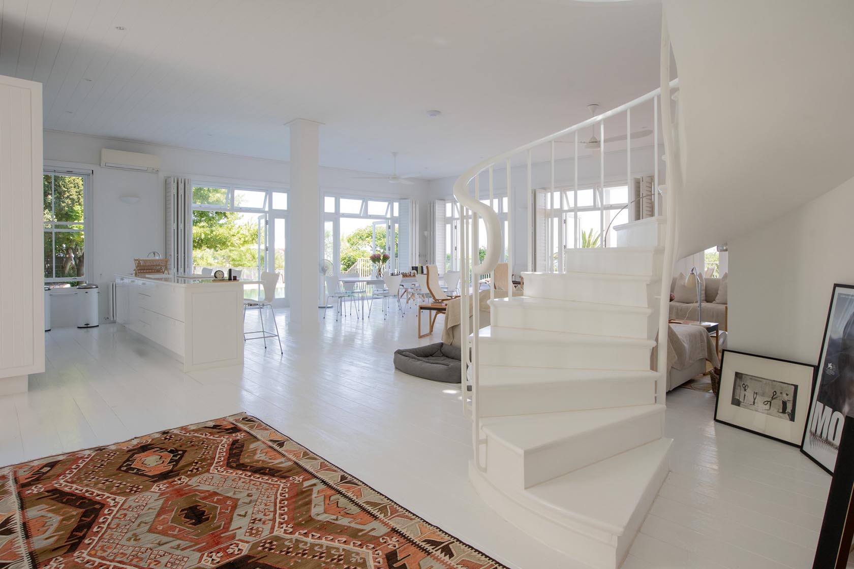 It’s as though Villa Oasis has slipped from the margin of an illustrated fairytale and taken root in the Atlantic Seaboard. Its white timber bones towering above the seaside suburb of Bantry Bay, defying the architectural trends of Cape Town, this hideaway exists as a world unto itself.