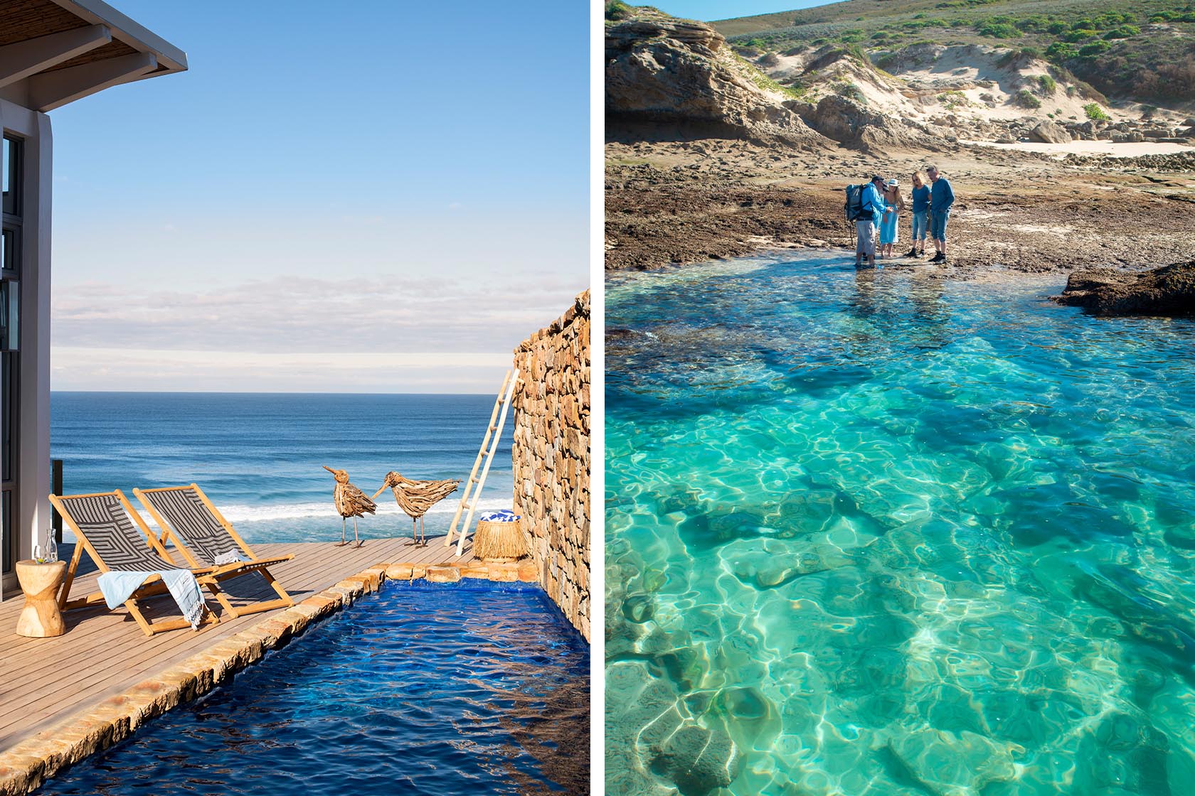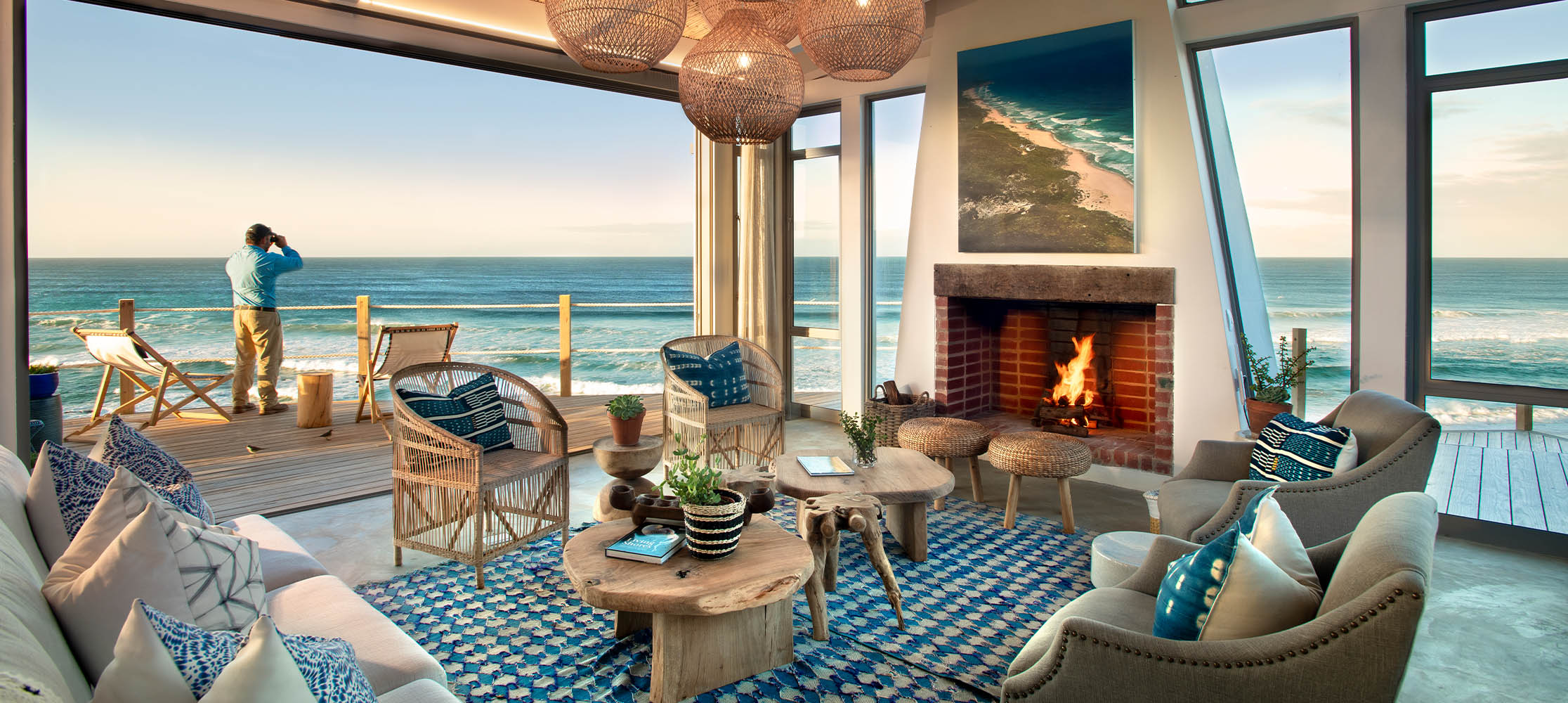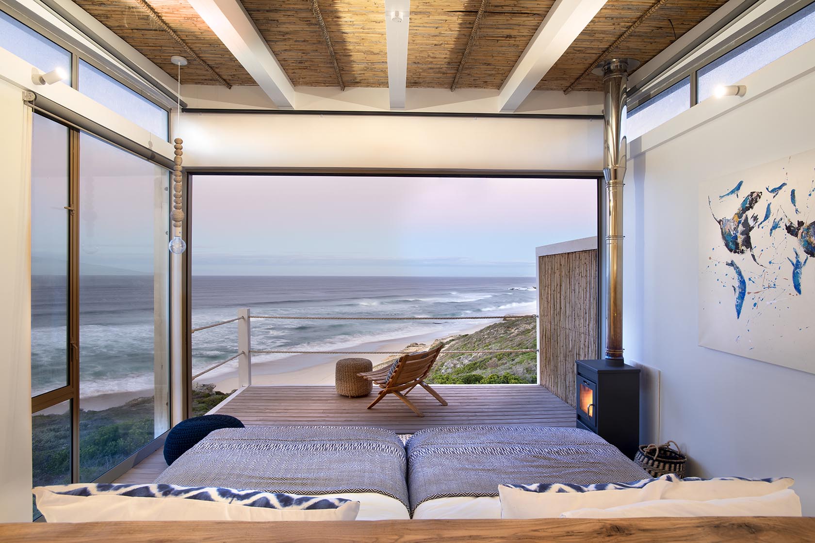 The lodge comprises a main building that’s elegantly done in natural fabrics and driftwood, with a plunge pool and wraparound deck for endless coastal gazing. Each of the seven guest rooms has floor-to-ceiling glass windows that offer stunning views of the Indian Ocean. The décor is inspired by the shoreline and rendered in cool blues and greys. There’s also a wood-burning stove in each room for cosy winter evenings, and a private veranda for endless, mesmerising gazing.