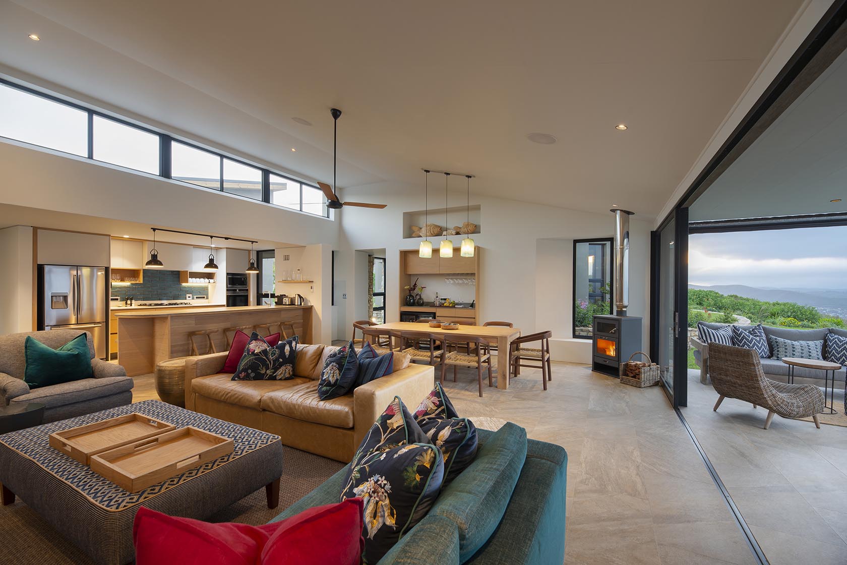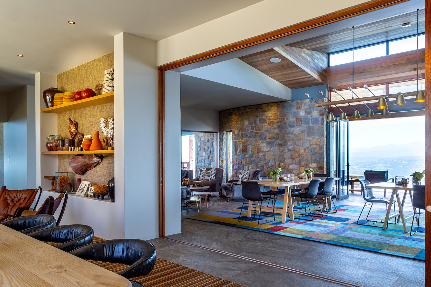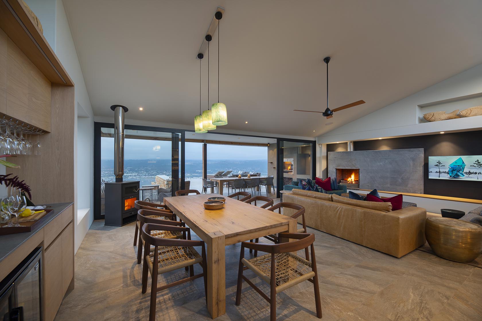 A TV-room and library, a slow lounge, dining and reclining spaces. A bar, indoor and outdoor cooking stations, long decks with long tables, extensions of living spaces that propel you out through the large, folding glass doors, over the swimming pool, the jacuzzi, the lush lawn, and into the thicket of the fynbos veld. The space is cohesive, yet endlessly forgiving and generous at every turn.