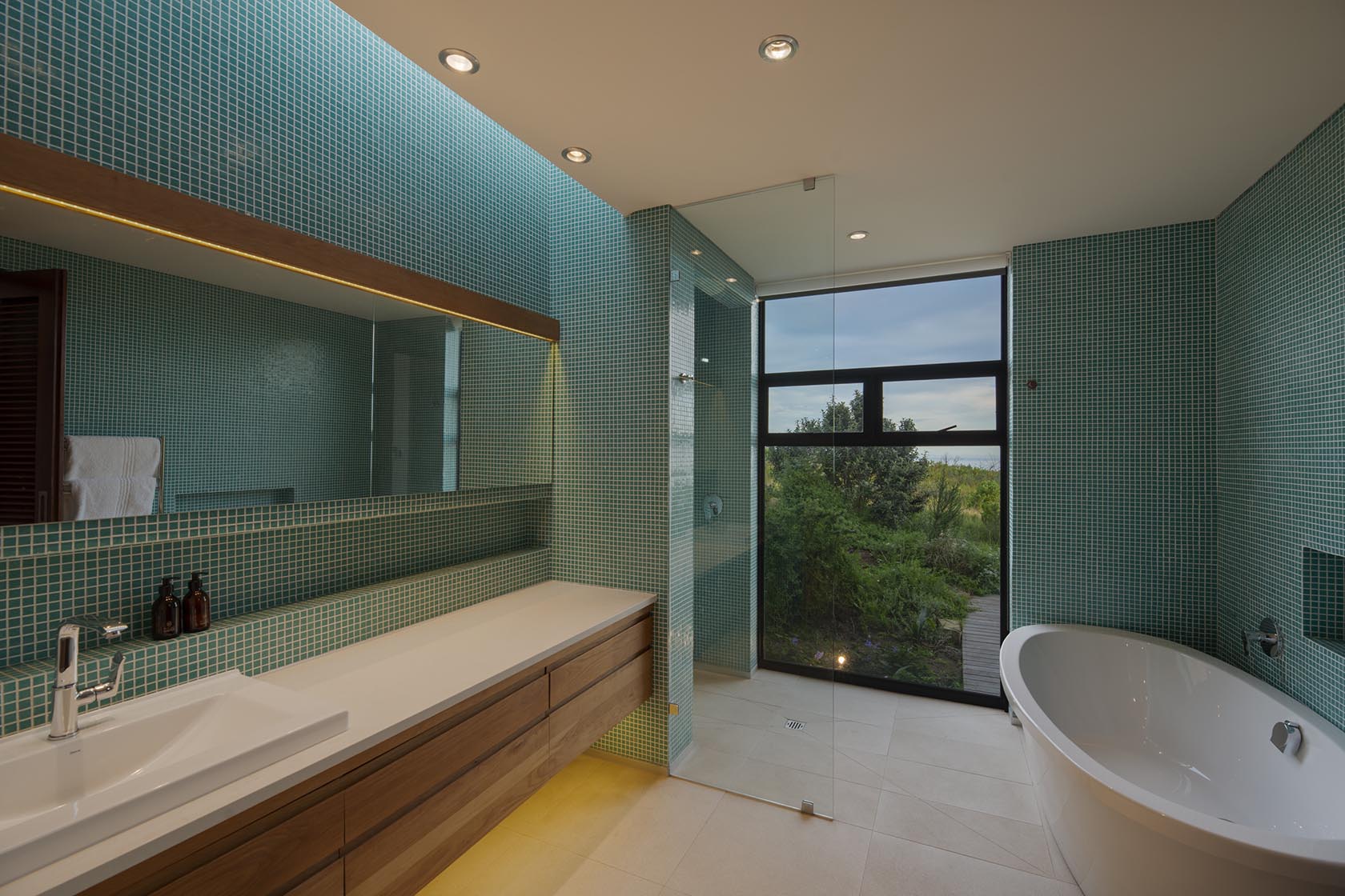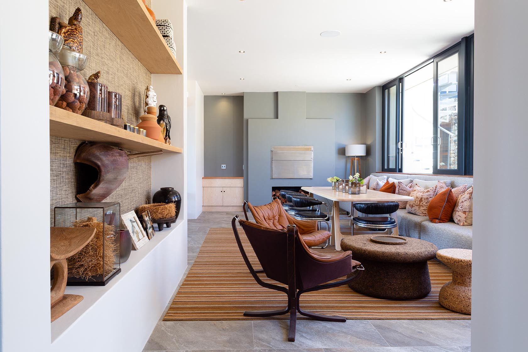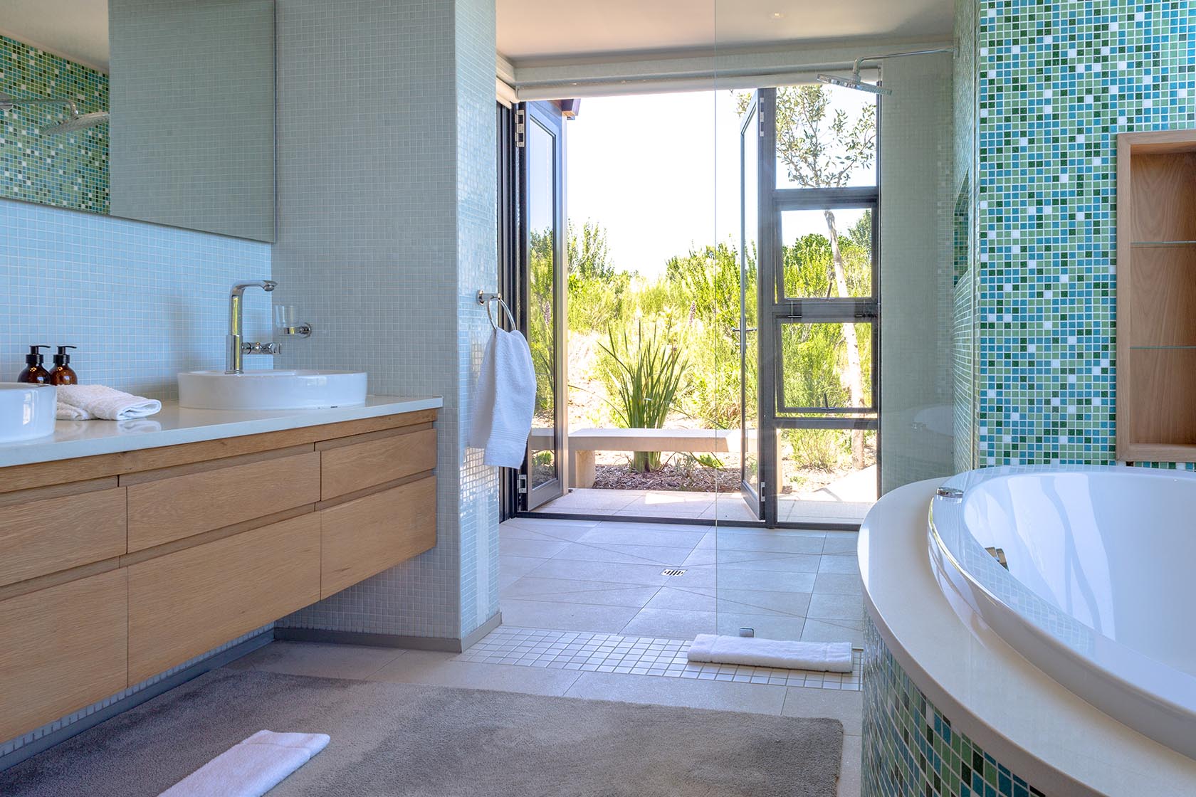 A TV-room and library, a slow lounge, dining and reclining spaces. A bar, indoor and outdoor cooking stations, long decks with long tables, extensions of living spaces that propel you out through the large, folding glass doors, over the swimming pool, the jacuzzi, the lush lawn, and into the thicket of the fynbos veld. The space is cohesive, yet endlessly forgiving and generous at every turn.