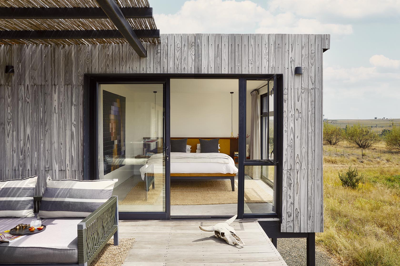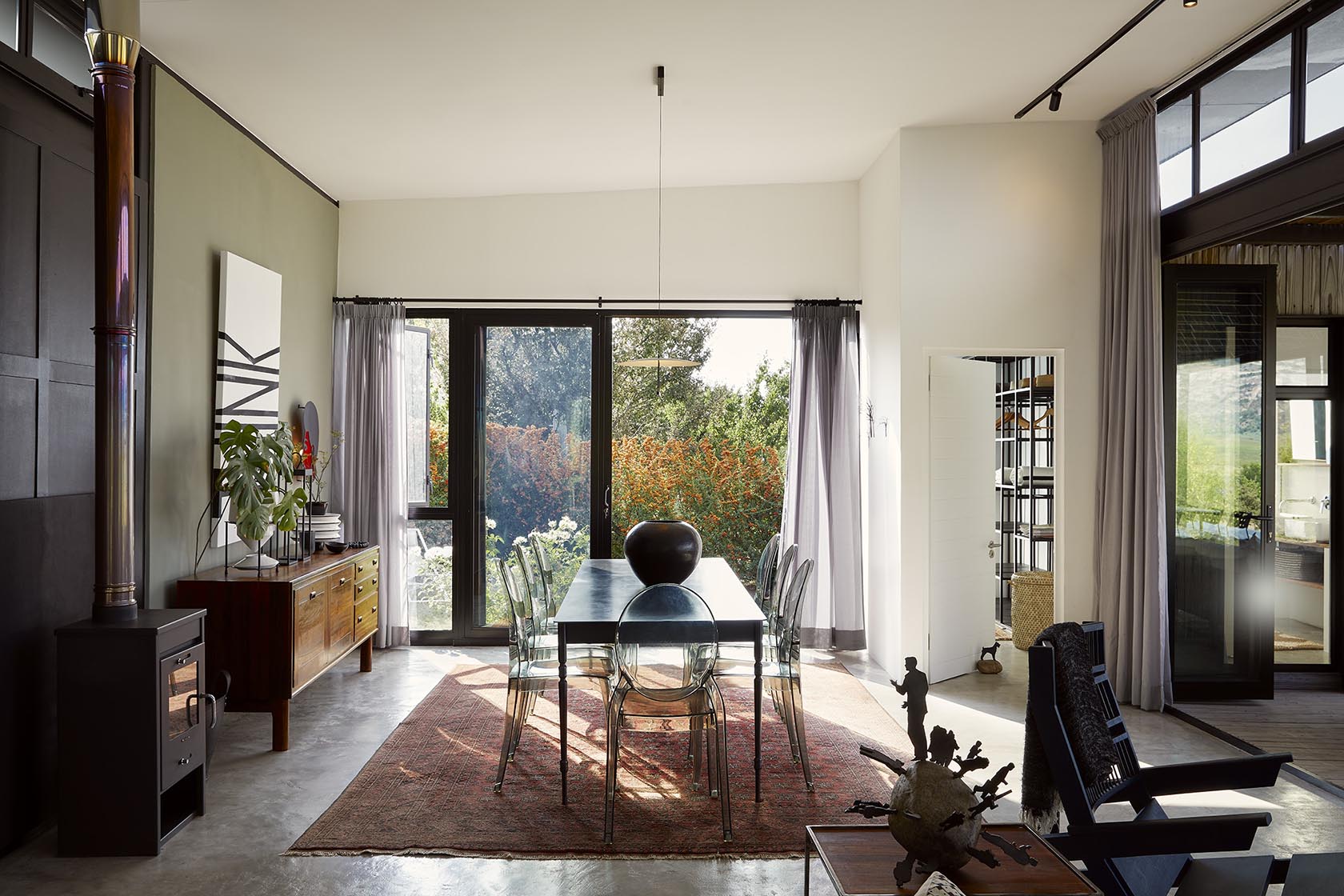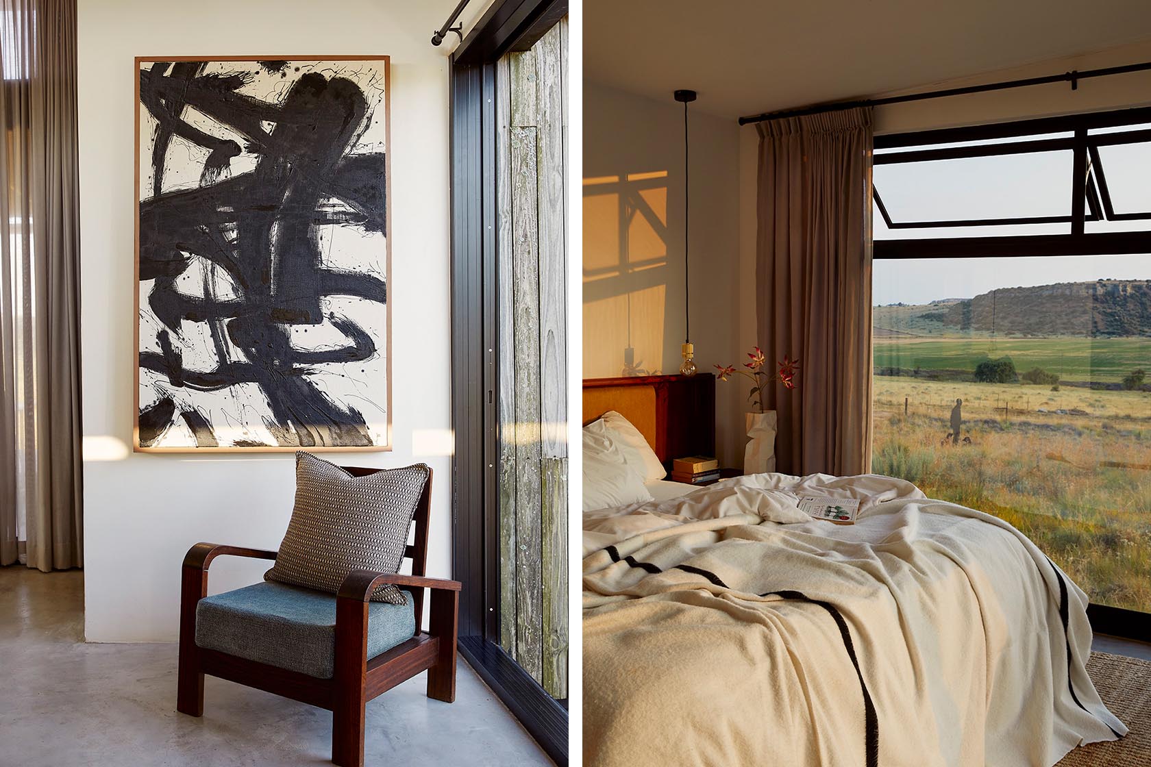 Spread across one level of living, dining, cooking and reclining spaces, this unique holiday home has been stylishly stitched together by its owner’s discernment for design. Vintage family heirlooms meet bespoke cabinetry and steel works. European collectables, avant-garde pieces of art and lighting, Persian and Nguni rugs, a Gregor Jenkins steel dining table and accompanying Ghost chairs all make this home an elegant, flamboyant take on farm stay accommodation in the Free State.