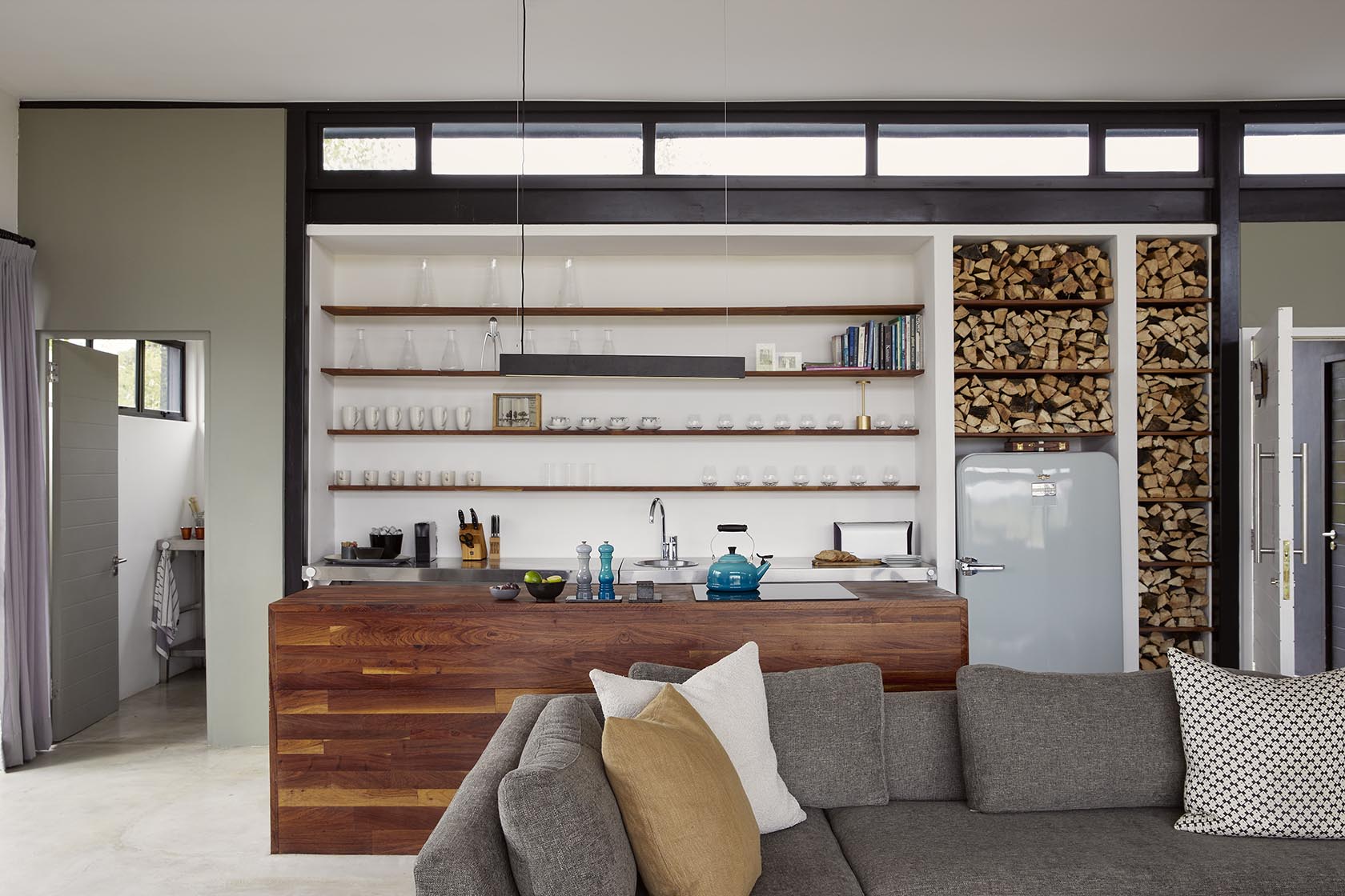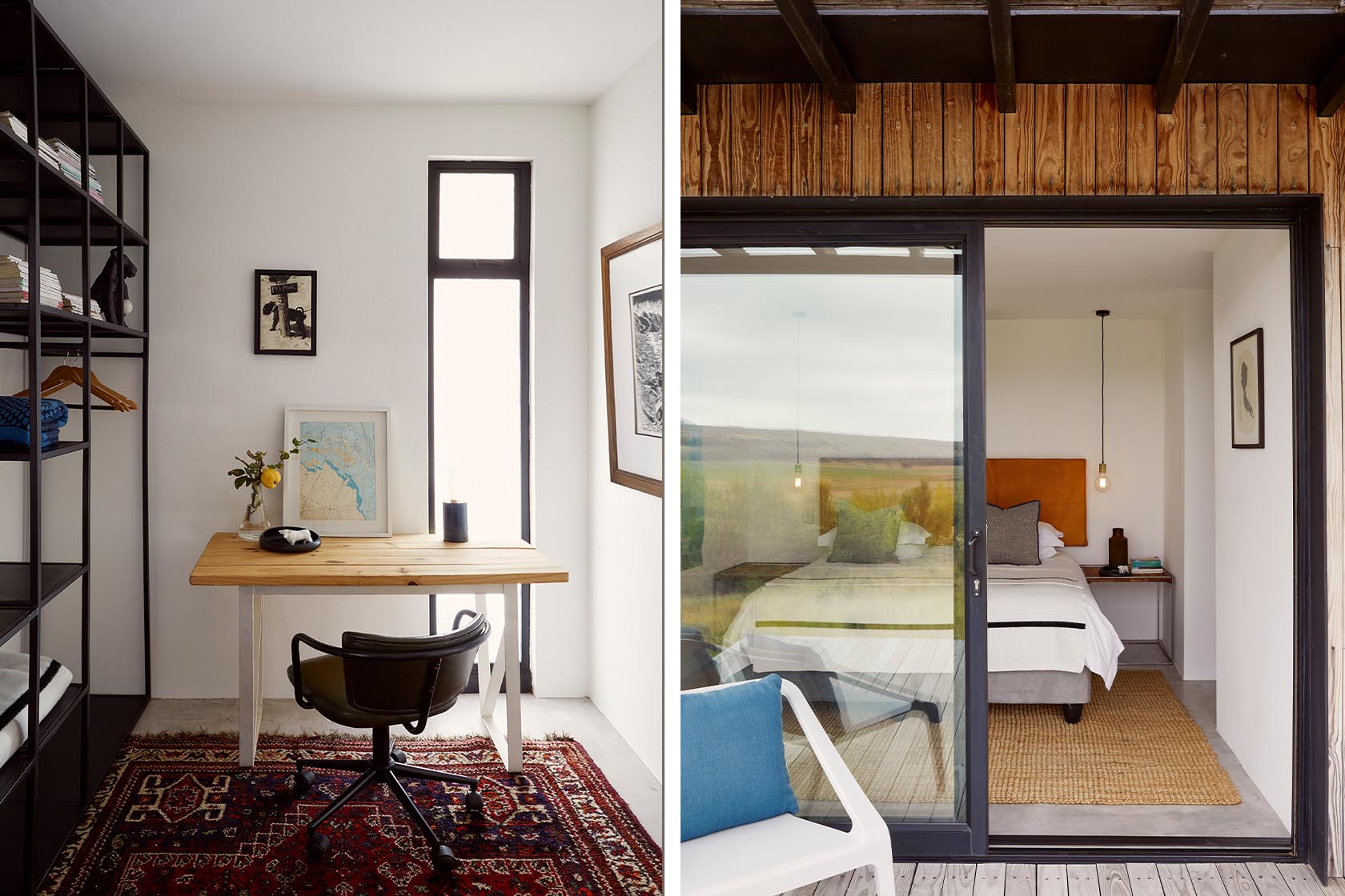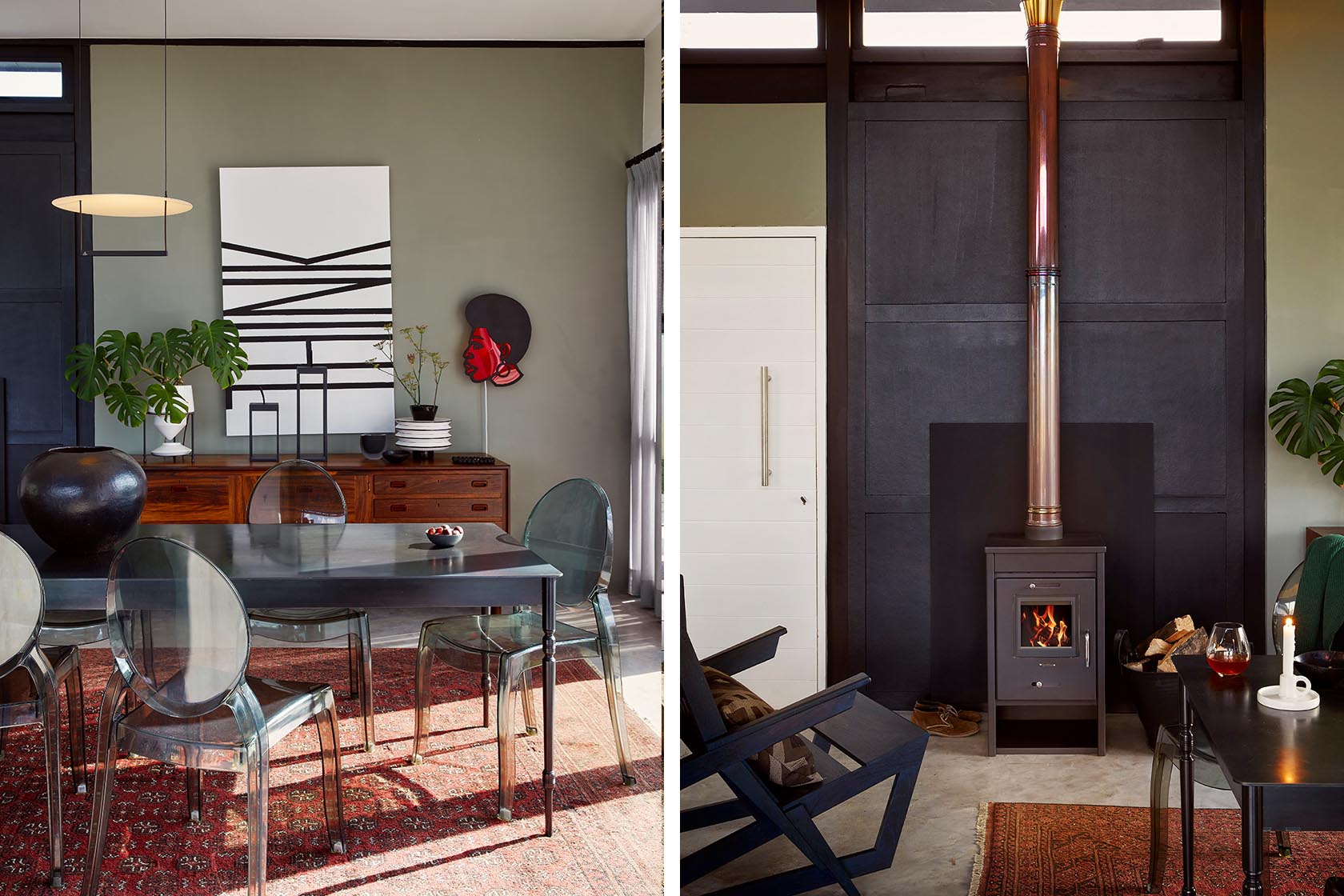 Spread across one level of living, dining, cooking and reclining spaces, this unique holiday home has been stylishly stitched together by its owner’s discernment for design. Vintage family heirlooms meet bespoke cabinetry and steel works. European collectables, avant-garde pieces of art and lighting, Persian and Nguni rugs, a Gregor Jenkins steel dining table and accompanying Ghost chairs all make this home an elegant, flamboyant take on farm stay accommodation in the Free State.