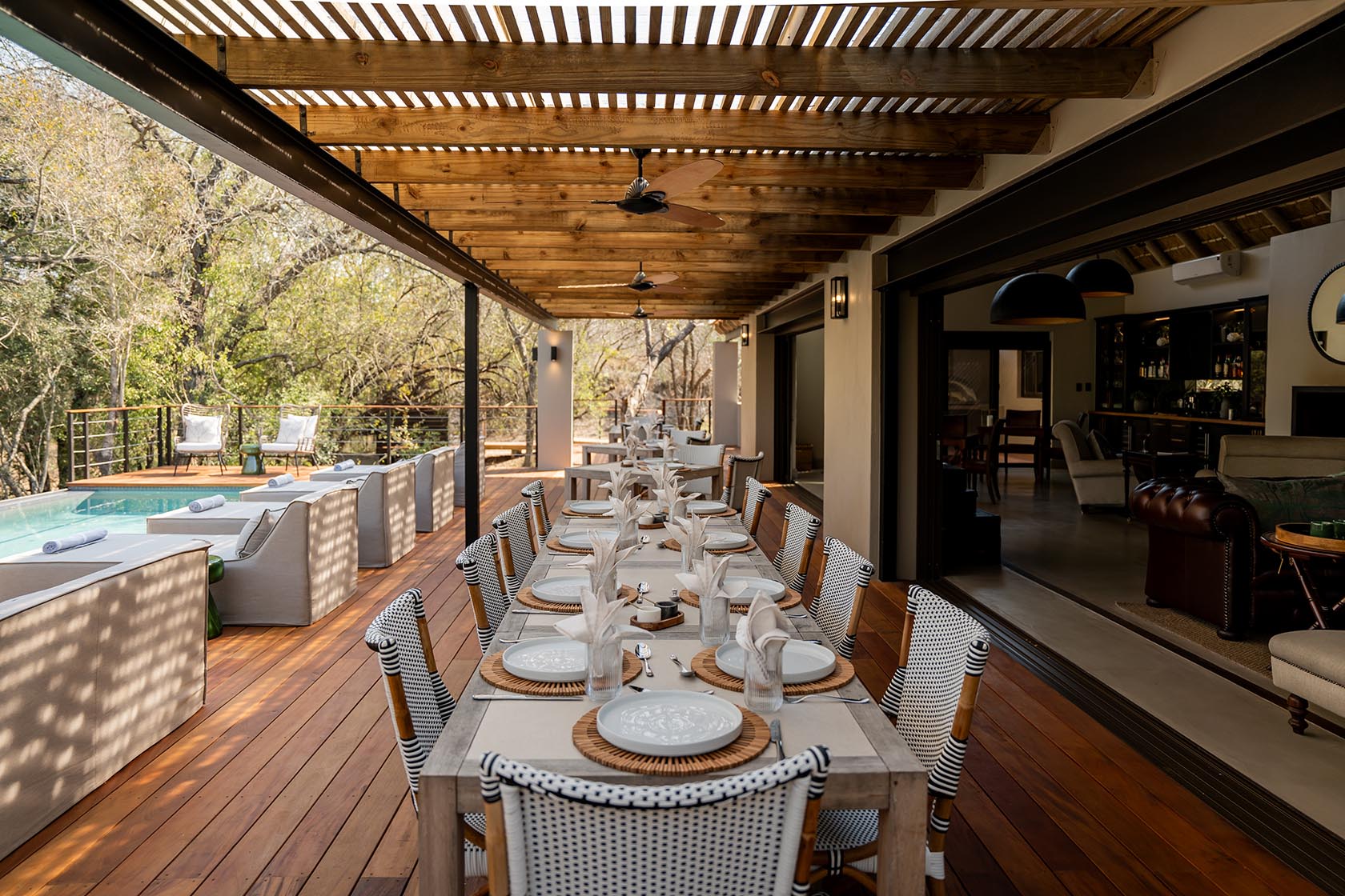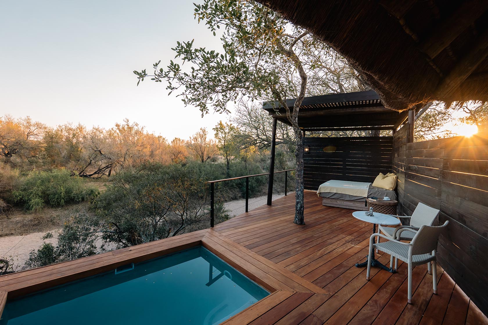 Pivoting from the sublime luxury of one of the nine elegantly appointed suites. Each with their own private deck, plunge pool, free-standing bathtub and shaded Sala bed. The occasional spa treatment or yoga practice at the wellness centre. A laidback workout session at the gym for those that love a guilt-free week of safari indulgences. Of which there will be many! Leisurely bush breakfasts and boma barbecues. Decadent à la carte menus to choose from, homemade pizzas from the outdoor pizza oven, and lavish dinners beneath the stars. Sundowners in special spots that mark the moment with your bush besties. You’ll be on your own clocks, of course, embarking on each activity in accordance with the sun’s safari dial.