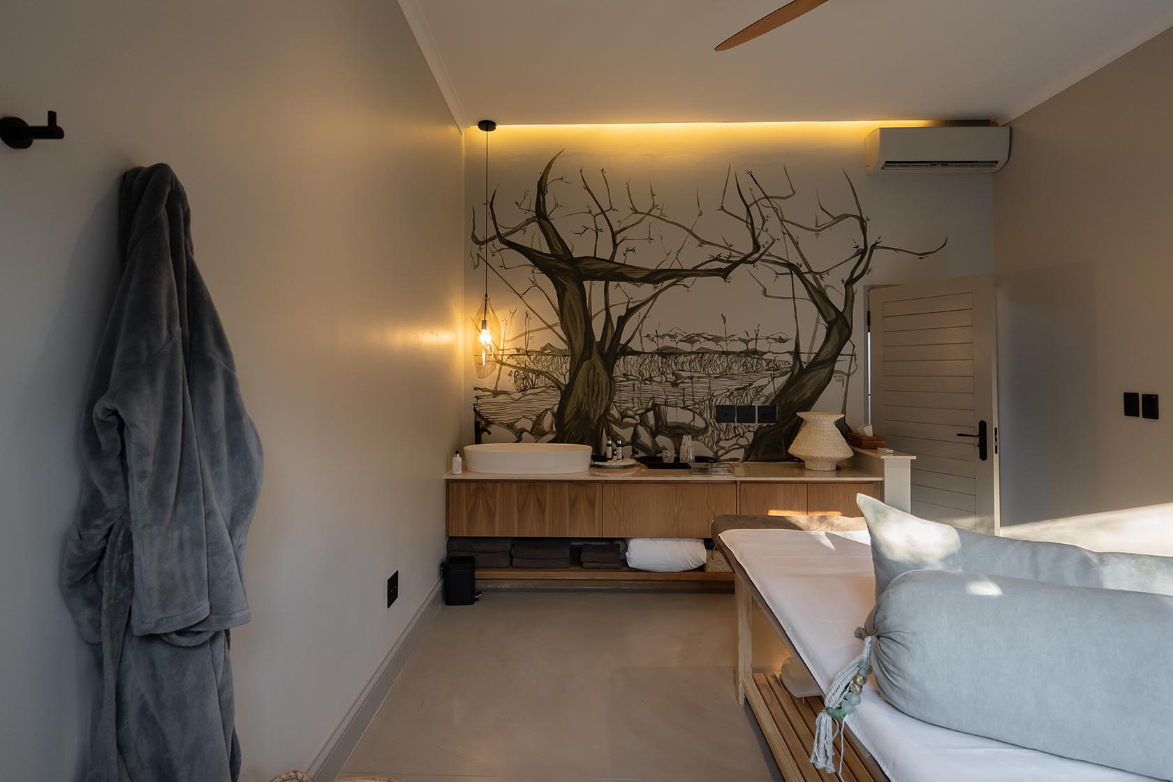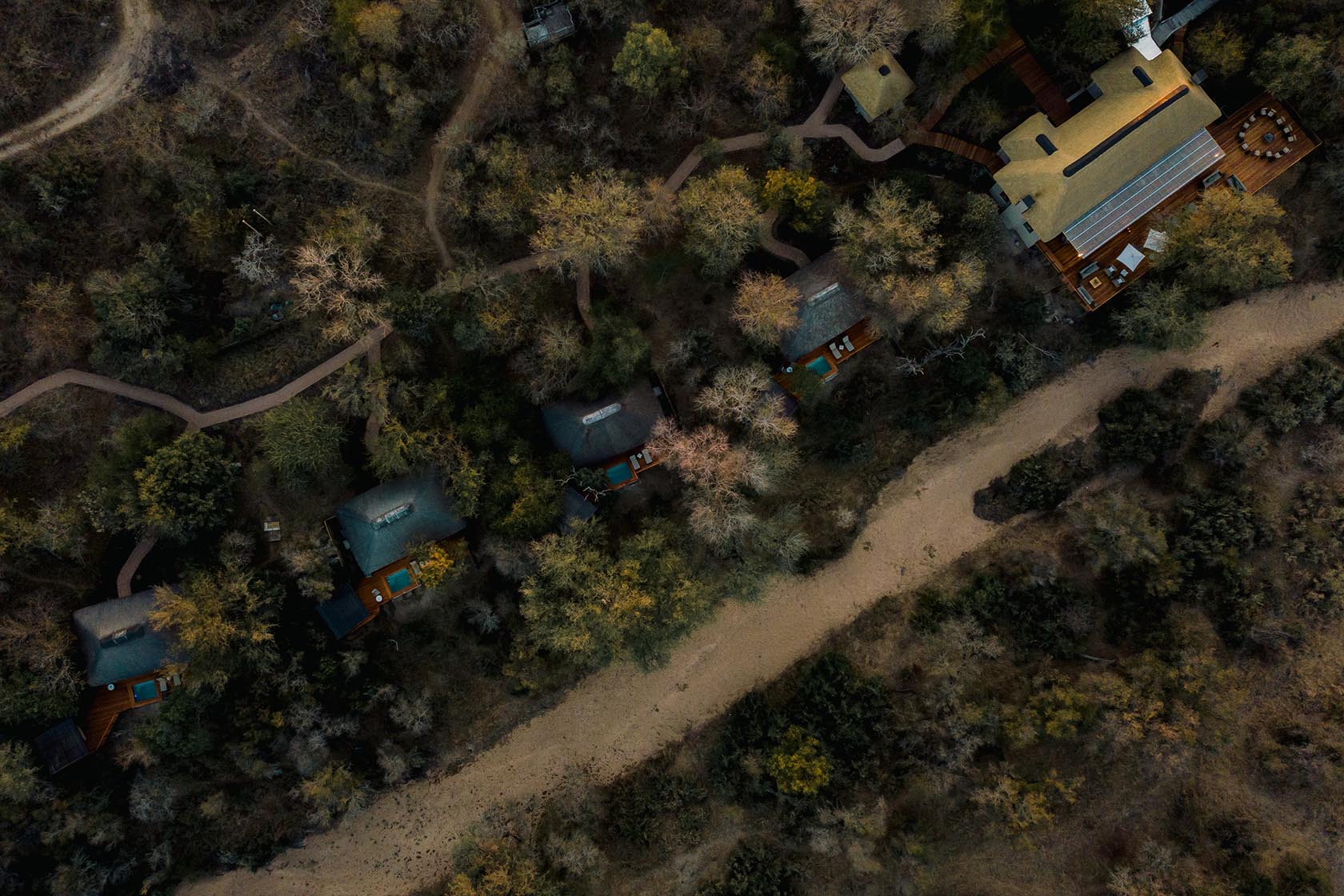The lodge stretches itself across the treetops of the old Knobthorns and Jackalberries, that frame the views of the landscape. An expansive main communal area, comprising of a dining, lounging, library and entertaining area harnesses itself into the soil. Overlooking a waterhole where herds of elephant, antelope, giraffe and all of the wild passers-by love to frequent. Sauntering and sipping as they claim their habitat and perform their rituals. As shall all of the guests, during their own occupation in the wilderness.