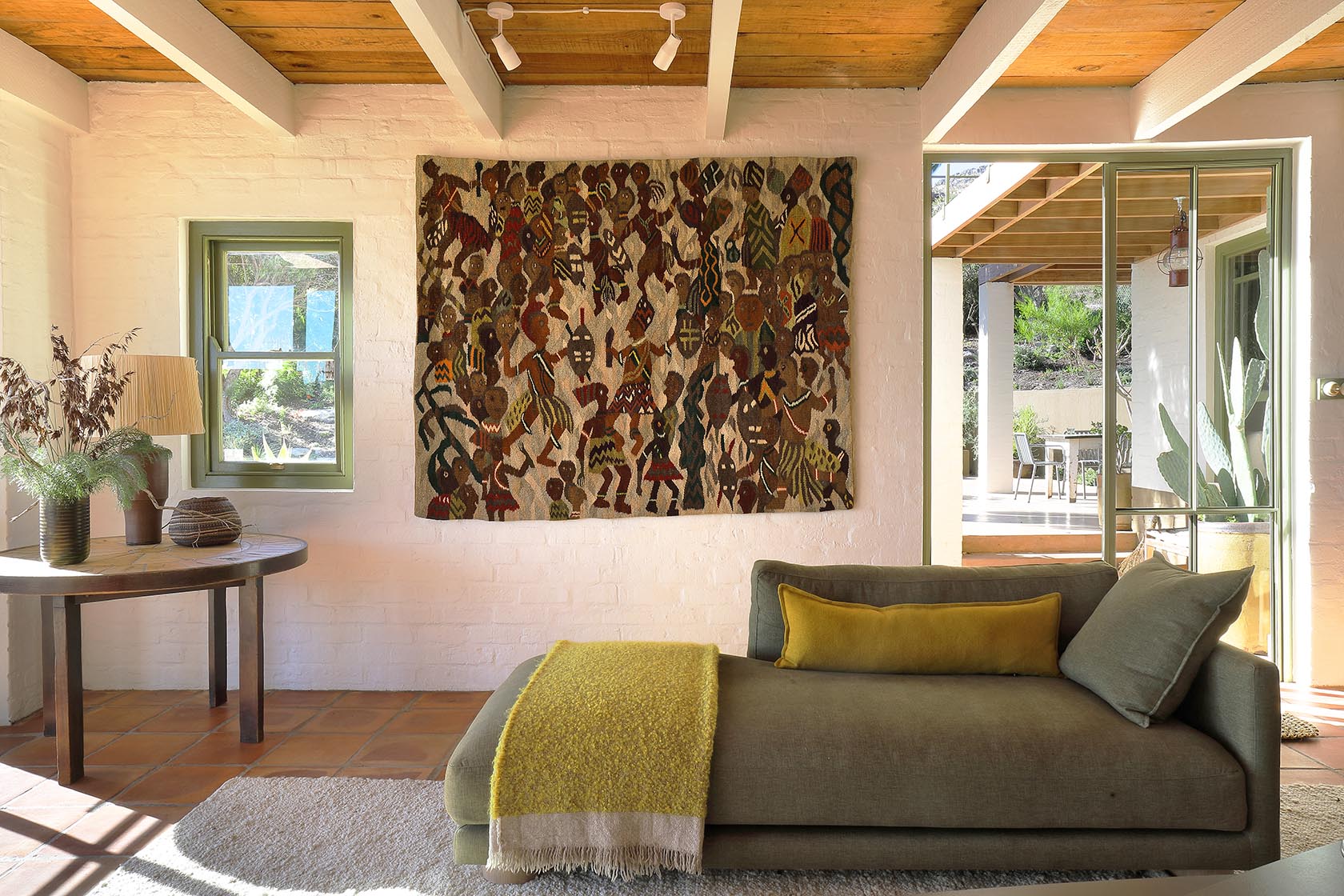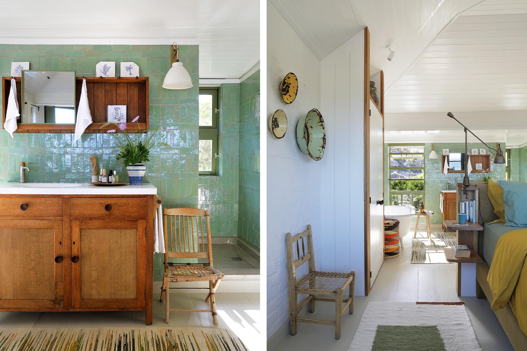 Upstairs, in the master suite, one of Frances’s works hangs above the bath, and Rorke’s Drift tapestries from the 60s and 70s were sourced on art auctions and brought back to Africa to hang here and in the second bedroom downstairs. Tonic Design’s canary yellow bedroom dresser is a joyful addition to the eclectic collection of furniture in this hideaway, where the value of craftsmanship is honoured around every corner.